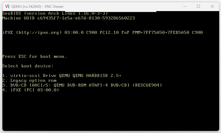 После этого перезапустите ваш сервер по ссылке "быстро" в меню личного кабинета, и сразу переключитесь в VNC консоль, ждите перезапуска. Как только увидите, что он начался, постоянно нажимайте ESC. Должно попасть примерно сюда: