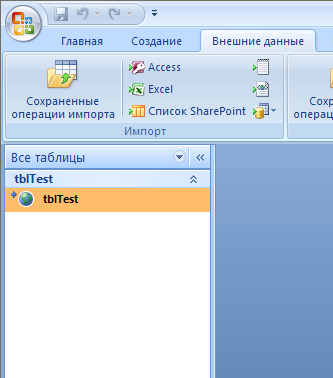 2. В группе "Импорт" раздела ленты "Внешние данные" программы Access 2007 выберите пункт "Дополнительно" и "База данных ODBC".