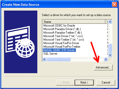5. Выберите в списке ODBC-драйвер mySQL и нажмите кнопку "Advanced" ("Дополнительно").